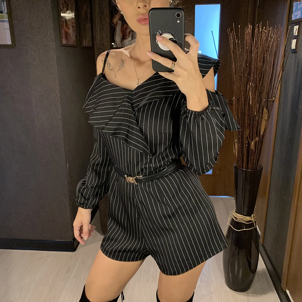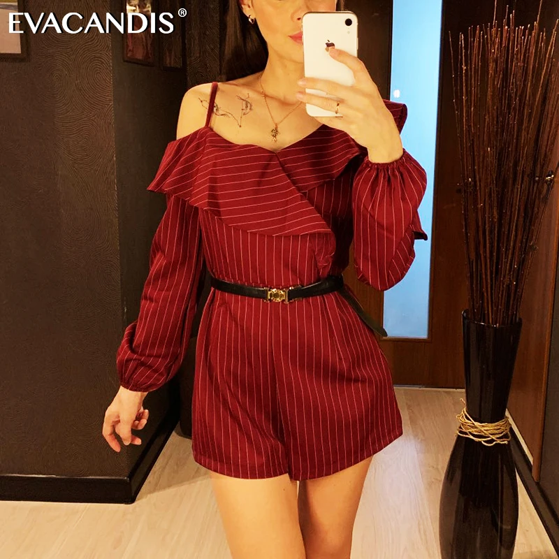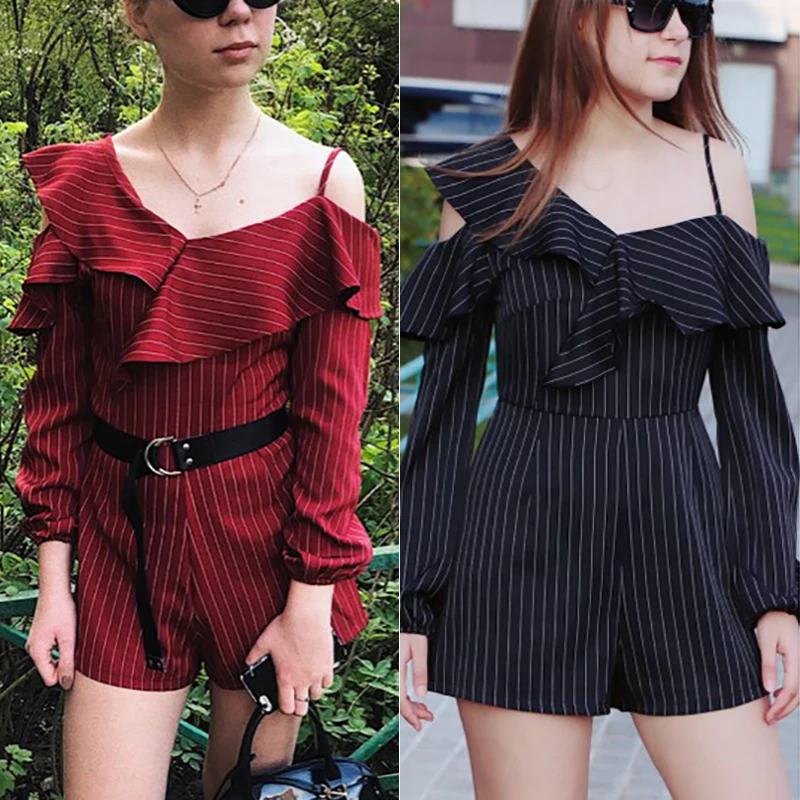 Special Offer Ruffle Breve Delle Donne Della Tuta A Righe Bianco A Maniche Lunghe con Spalle Nero Boho Rosso Rosa Sexy di Estate Spiaggia Body e Pagliaccetti Delle Donne Della Tuta Discount 24% Today!