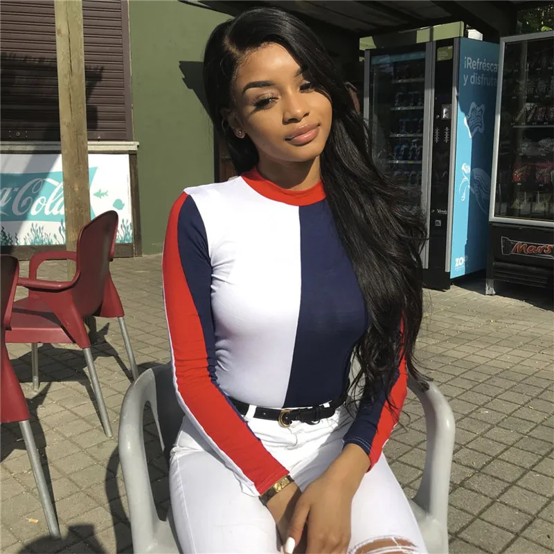 Product Name: BOOFEENAA Blocco di Colore O Collo A Manica Lunga Della Tuta Delle Donne Sexy Autunno Magliette e camicette Streetwear Cotone Aderente Body e Tutine Clubwear C55 AA19