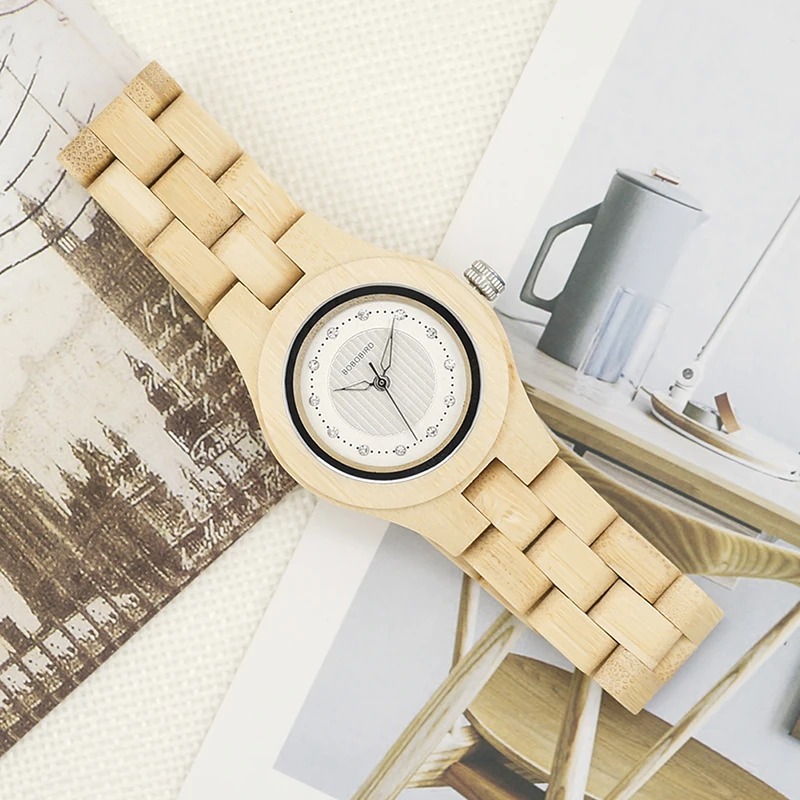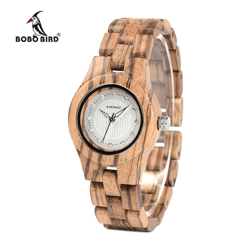 Product Name: BOBO UCCELLO Orologio Delle Donne Di Bambù Zebra di Legno Gemme Imitate di Lusso del Quarzo di Marca di Orologi in Scatola di Legno XFCS relogio feminino W O29