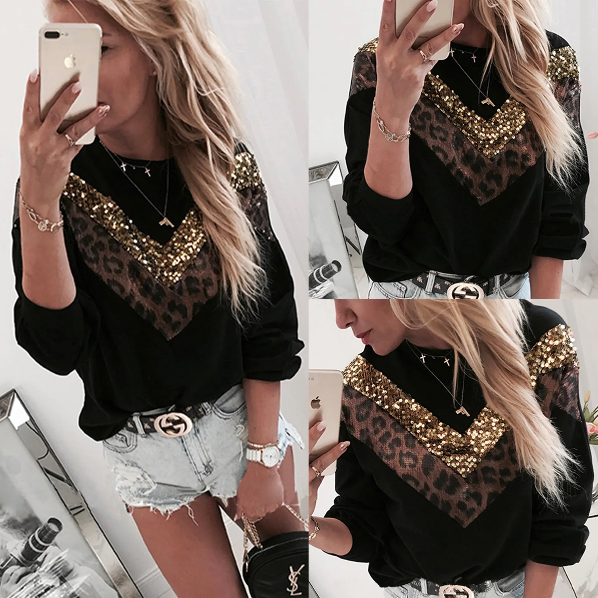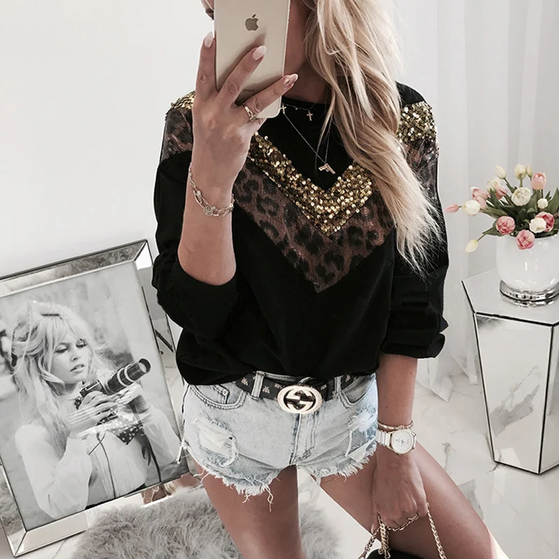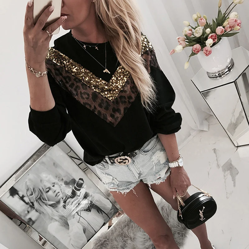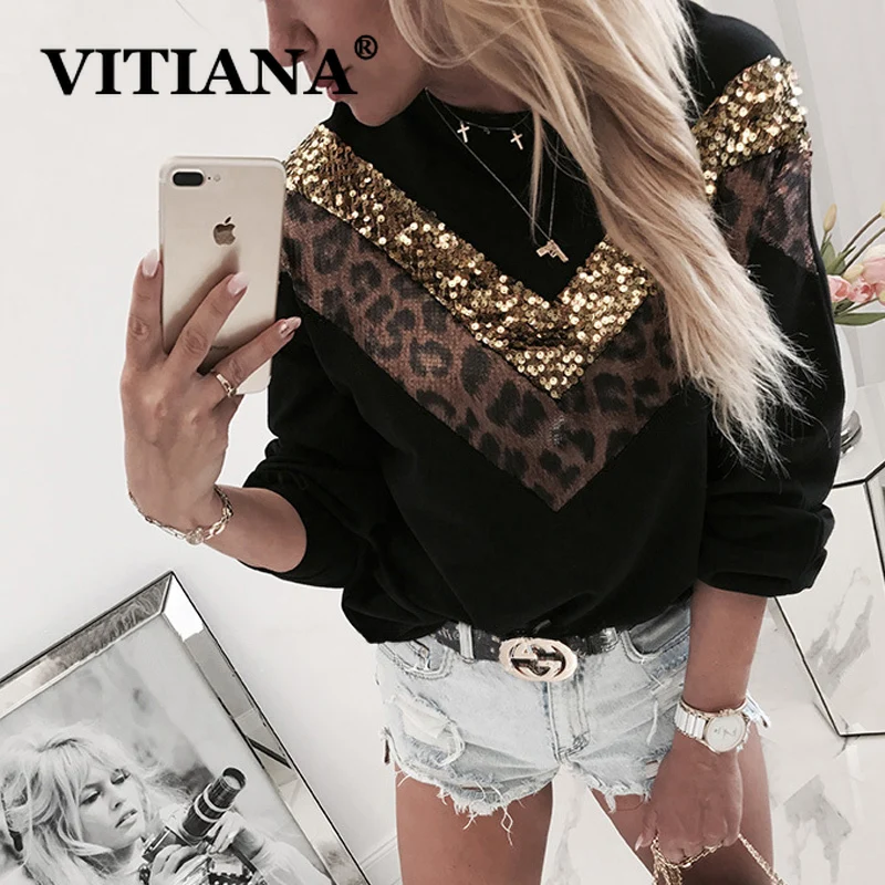 Special Offer VITIANA casual Felpe Felpa Autunno 2019 Femminile Manica Lunga Leopardo Nero di Paillettes Con Cappuccio Felpe Femme Felpa Con Cappuccio Magliette e camicette Discount 35% Today!