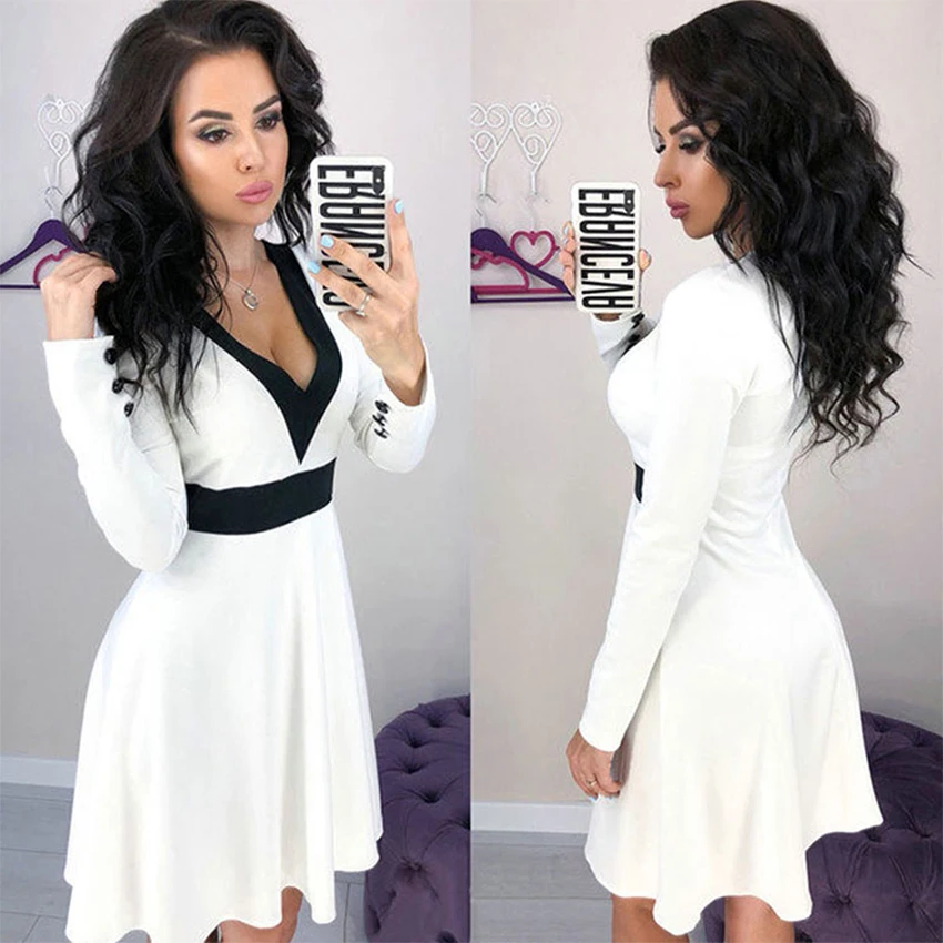 . (39% Off) Comprare Elasticità Sexy Scollo A V Mini Abiti Delle Donne di Autunno Solido Manica Lunga Nero Patchwork A Line Del Vestito Femminile casual Vestito Da Alta Qualità Economici Prezzo Online.