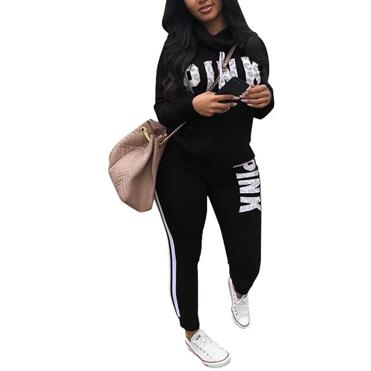 Product Name: Plus Size 2 Pezzi Set Donne Tuta di Alta Collo Lettera ROSA Stampa Pantaloni di Felpa Set Nero Streetwear casual Vestito 2019 XXL