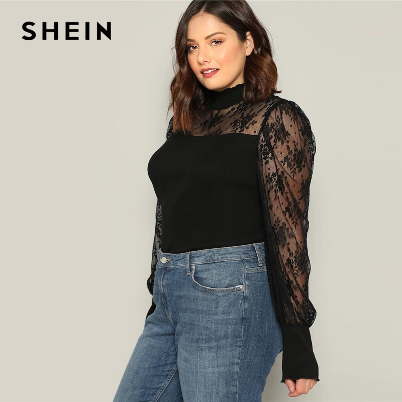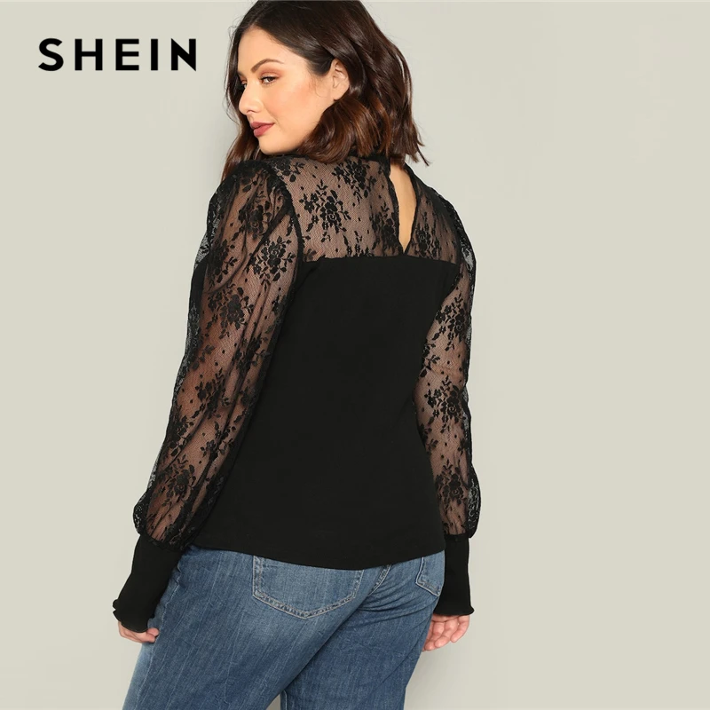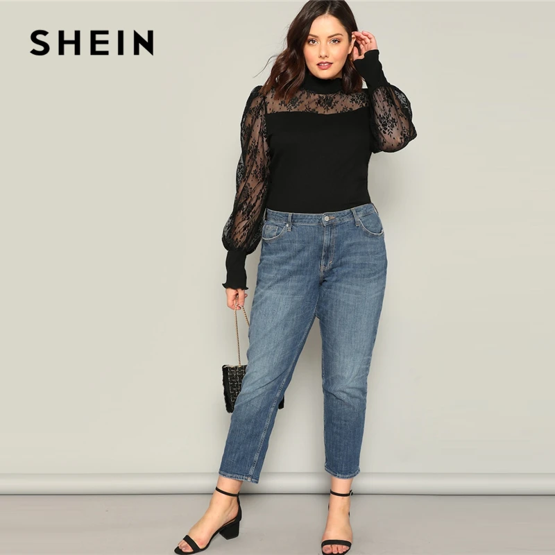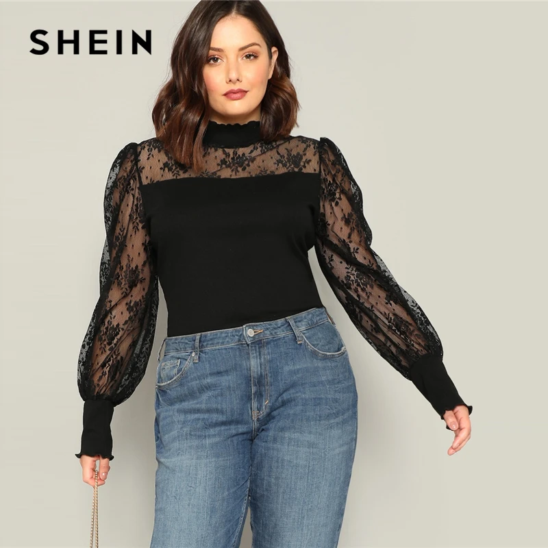 Special Offer SHEIN Più Il Formato Maglia Nera Puff Manica Lunga Del Collare Del Basamento Delle Donne Casual T Camicia 2019 Primavera Elegante Solido Magliette e camicette Tee Discount 41% Today!