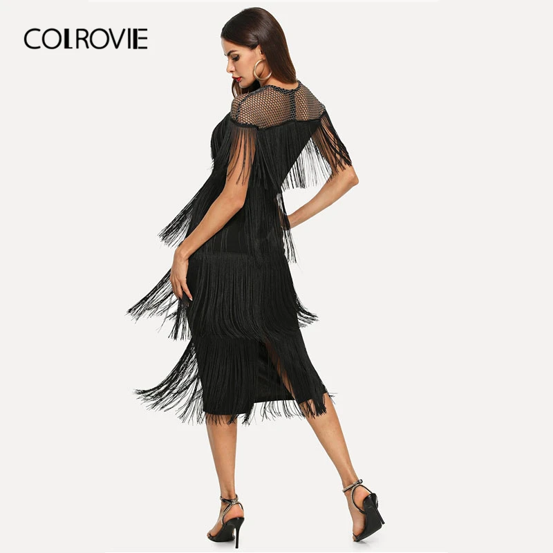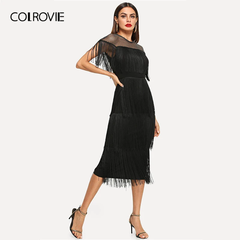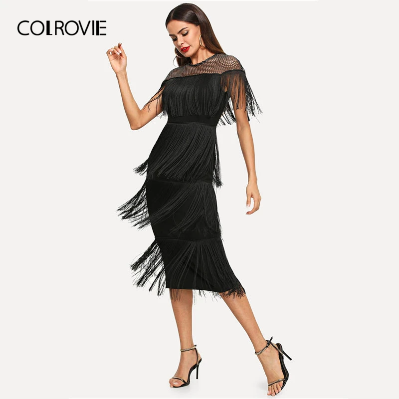 Special Offer COLROVIE Nero calze A Rete Maglia Giogo A Strati Frangia Aderente Vestito Sexy Delle Donne 2019 di Estate Slim Fit Matita Ufficio Delle Signore Vestiti Lunghi Discount 42% Today!