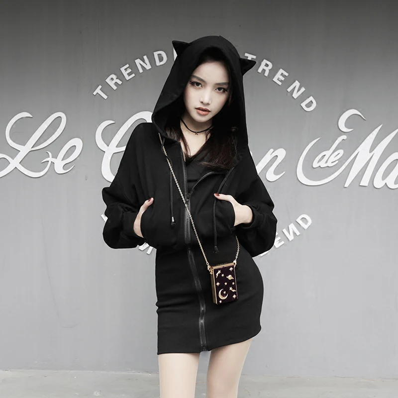 Product Name: Kawaii Felpa Con Cappuccio Harajuku Lungo della Maglietta Felpata Delle Donne Nero Punk Gotico Felpe Signore Hoody Zip up 2019 Autunno Carino Orecchio di Gatto felpe