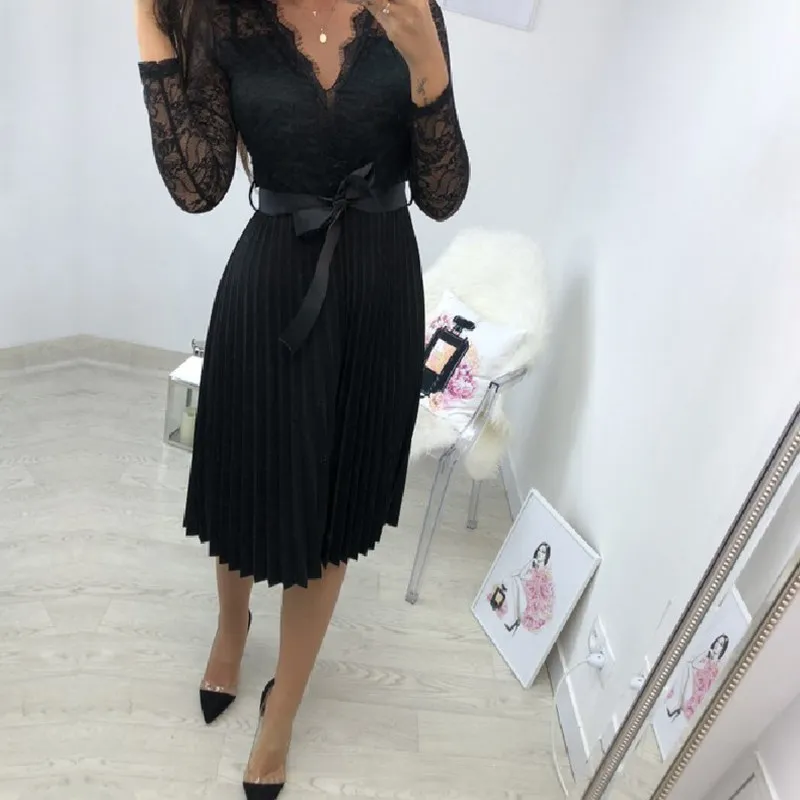 Special Offer GUMPRUN Estate casual Vestito 2019 Delle Donne Del Merletto A Pieghe Del Vestito Manica Lunga Elegante Fresco Del Nastro Del Nero Hollow Chiffon Vestito Longuette Discount 47% Today!