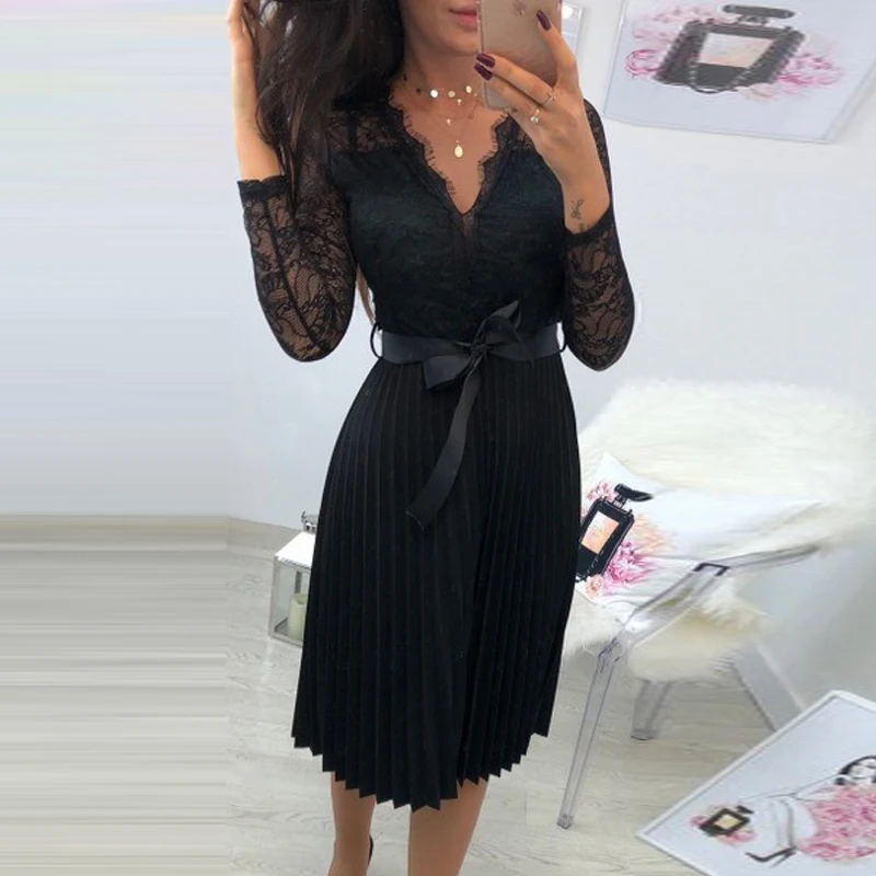 . (47% Off) Comprare GUMPRUN Estate casual Vestito 2019 Delle Donne Del Merletto A Pieghe Del Vestito Manica Lunga Elegante Fresco Del Nastro Del Nero Hollow Chiffon Vestito Longuette Economici Prezzo Online.