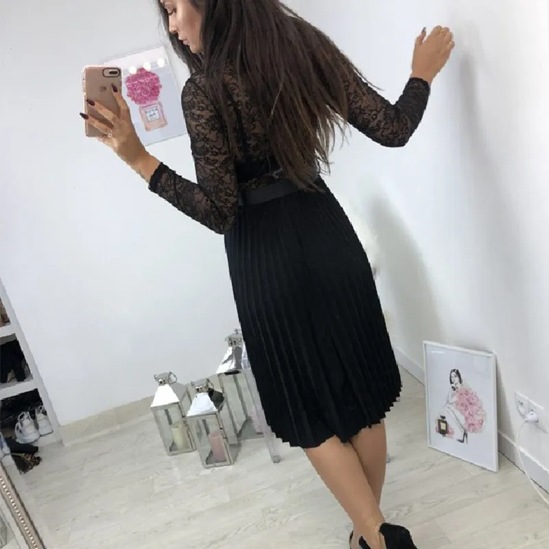 Product Name: GUMPRUN Estate casual Vestito 2019 Delle Donne Del Merletto A Pieghe Del Vestito Manica Lunga Elegante Fresco Del Nastro Del Nero Hollow Chiffon Vestito Longuette