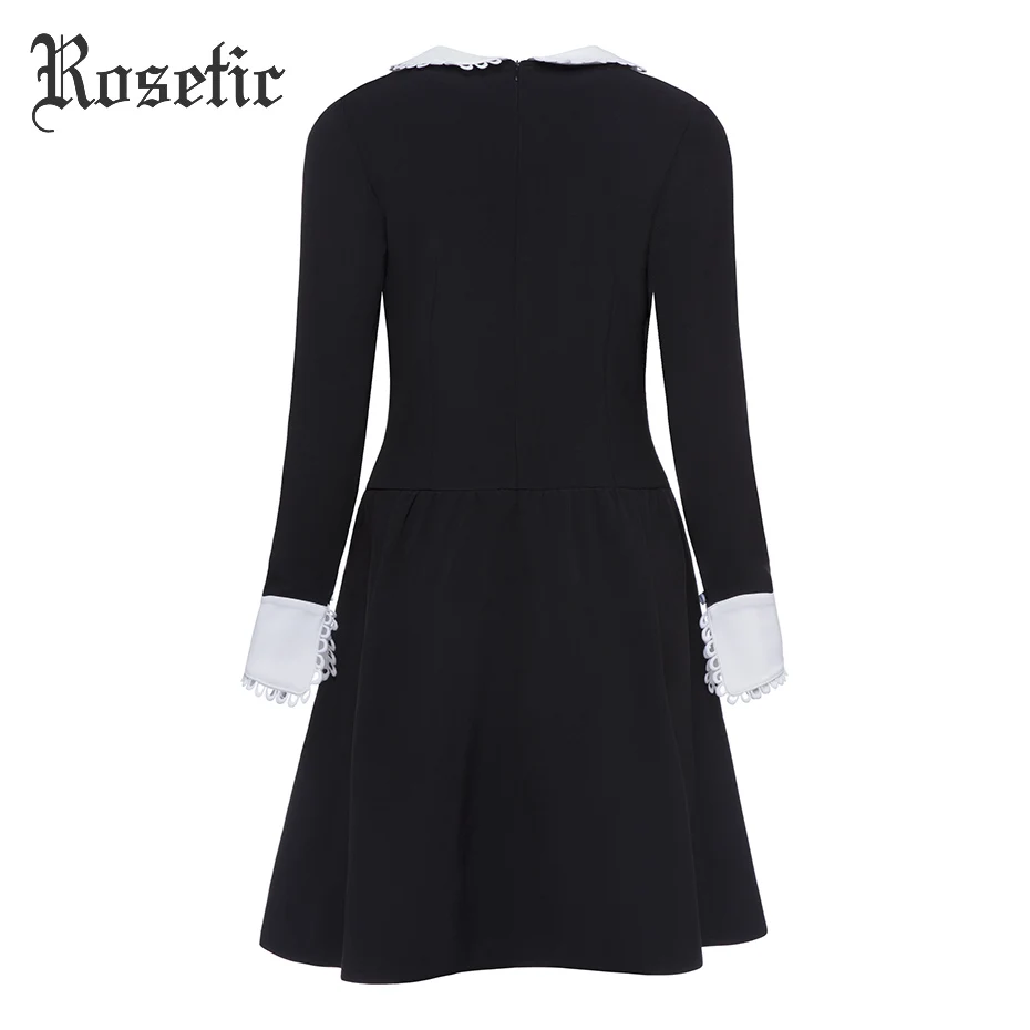 Product Name: Rosetic Dell annata Del Vestito Nero Delle Donne di Autunno Patchwork Una Linea Sottile Del Peter Pan Del Collare Della Signora Ufficio di Gusto Squisito di Modo Vestiti Gotici