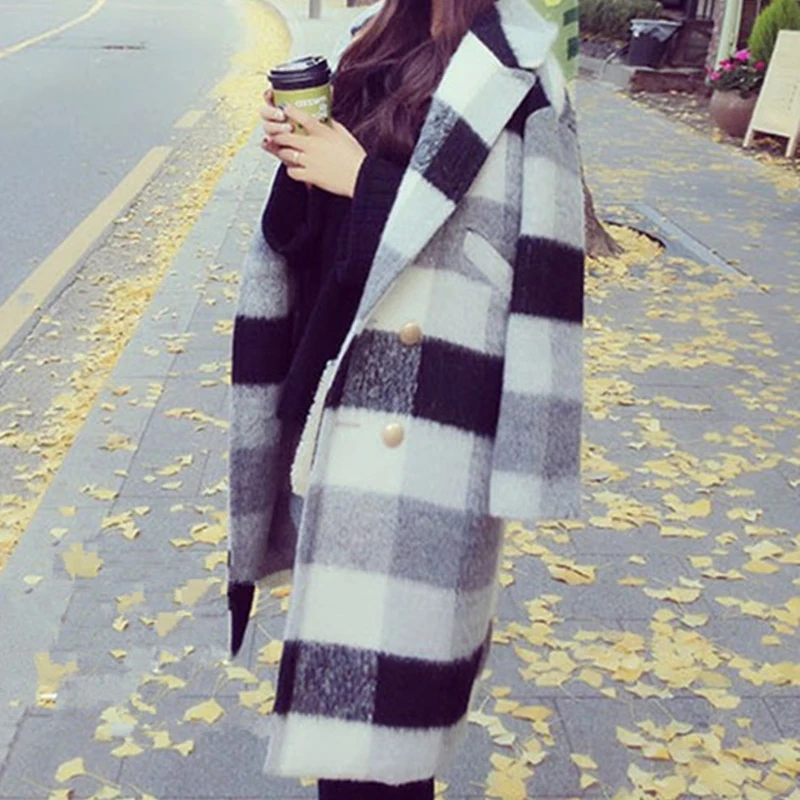 Product Name: Ailegogo Nuovo Autunno Inverno Cashmere trench e Impermeabili Giacca Donne casual Nero Bianco Plaid di Spessore Cappotto Caldo Pulsante Tasca Giubbotti