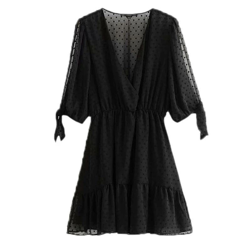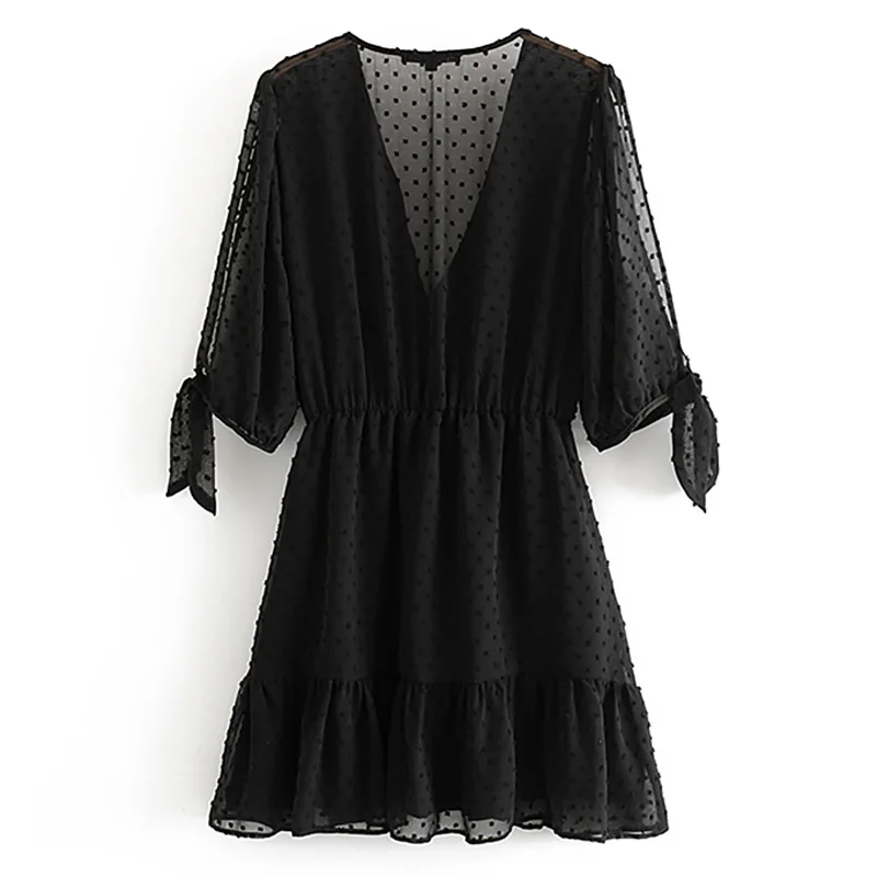 Product Name: Estate Sexy Profondo Scollo A V Dress Net Vedere Attraverso Tre Quarti Femminile casual Nero Abiti Abiti FFZYQ404