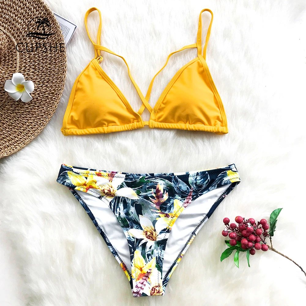 Special Offer CUPSHE Giallo Stampa Floreale E Solido Croce Insiemi del Bikini Delle Donne Del Cuore del Collo Backless Due Pezzi Costumi Da Bagno 2018 Sexy Perizoma Costumi Da Bagno Discount 47% Today!