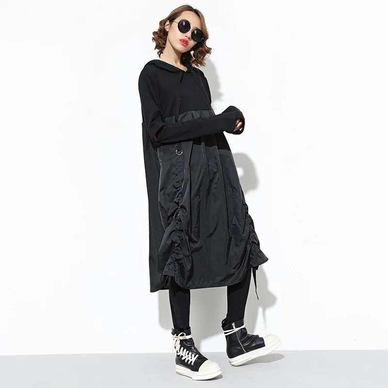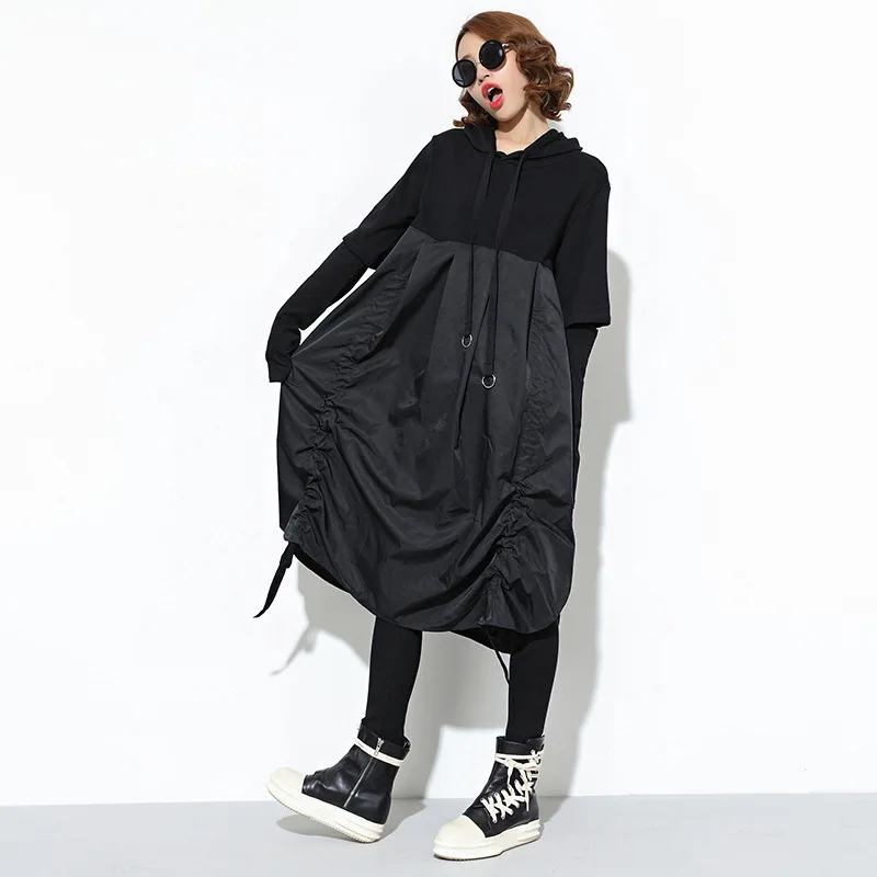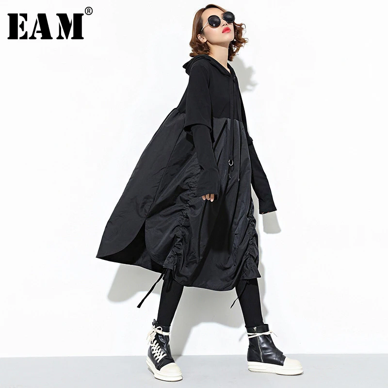 Special Offer [EAM] 2019 Nuova Primavera Con Cappuccio A Maniche Lunghe Con Coulisse Nero Piega Split Misto Allentato Delle Donne Del Vestito Lungo di Modo di Marea JD07601 Discount 29% Today!