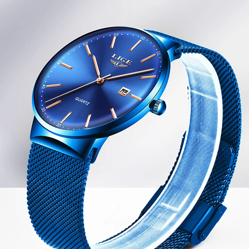 Product Name: Relogio Masculino Nuovi Mens Orologi LIGE Top di Marca di Lusso Della Vigilanza di Modo Sottile Maglia Data di Orologio Al Quarzo Impermeabile Per Gli Uomini Blu orologio