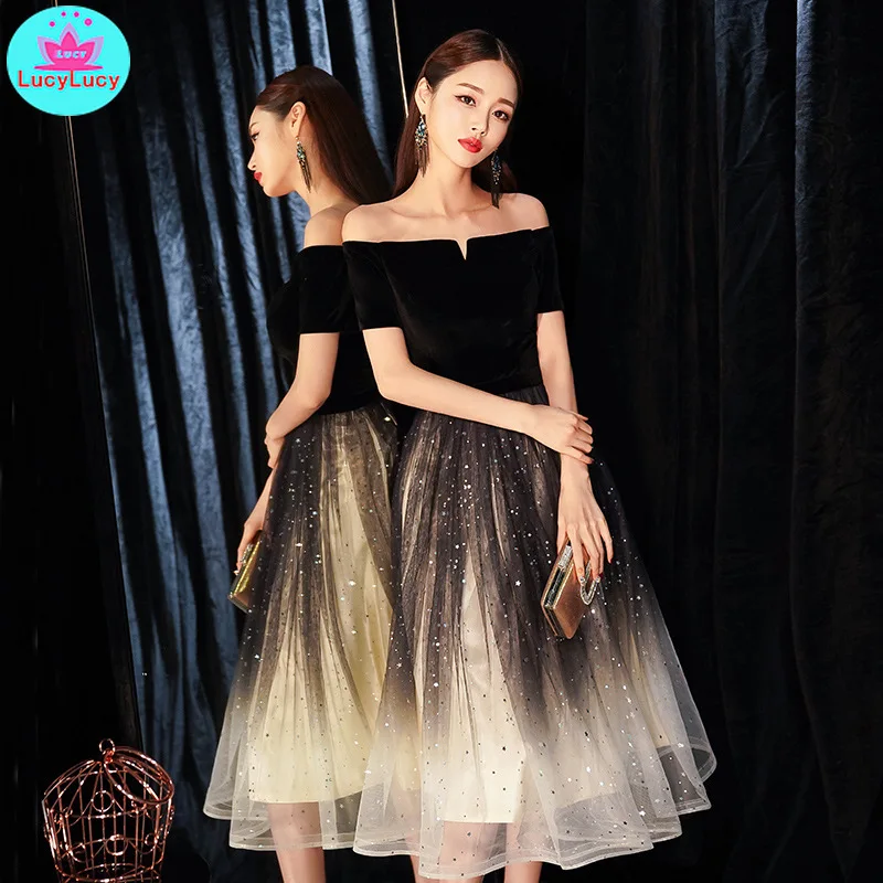 Special Offer 2019 nuovo banchetto elegante nero sexy lungo tratto di spalla parola sottile che dimagrisce il vestito partito Largo della Spalla Della Rappezzatura Discount 22% Today!