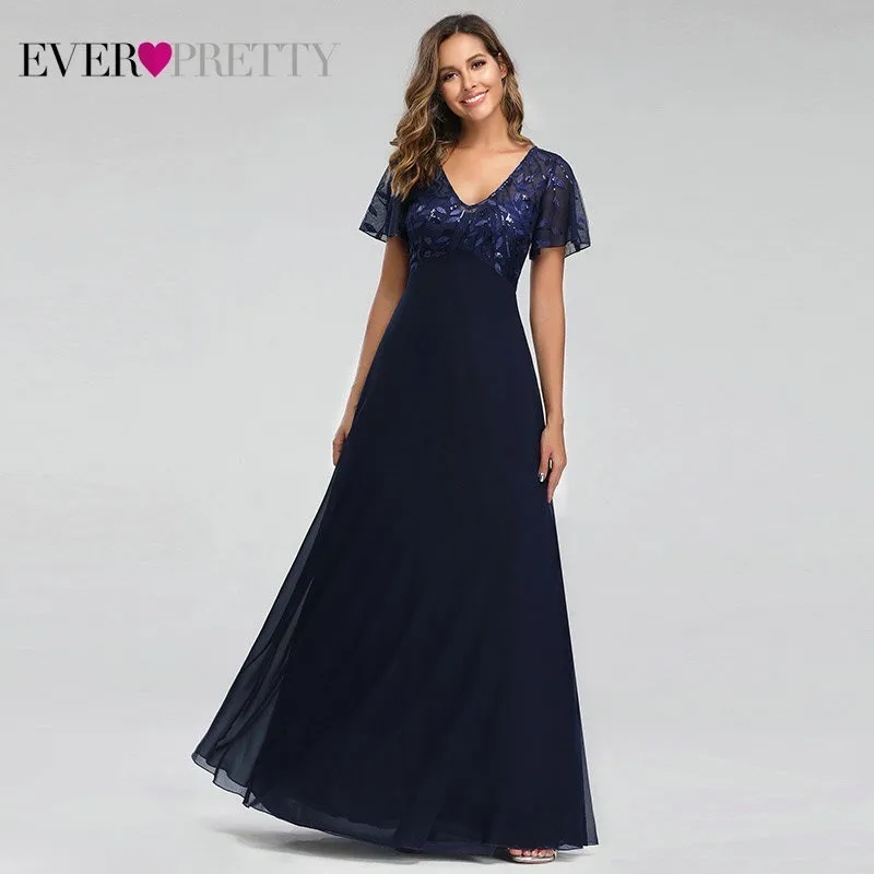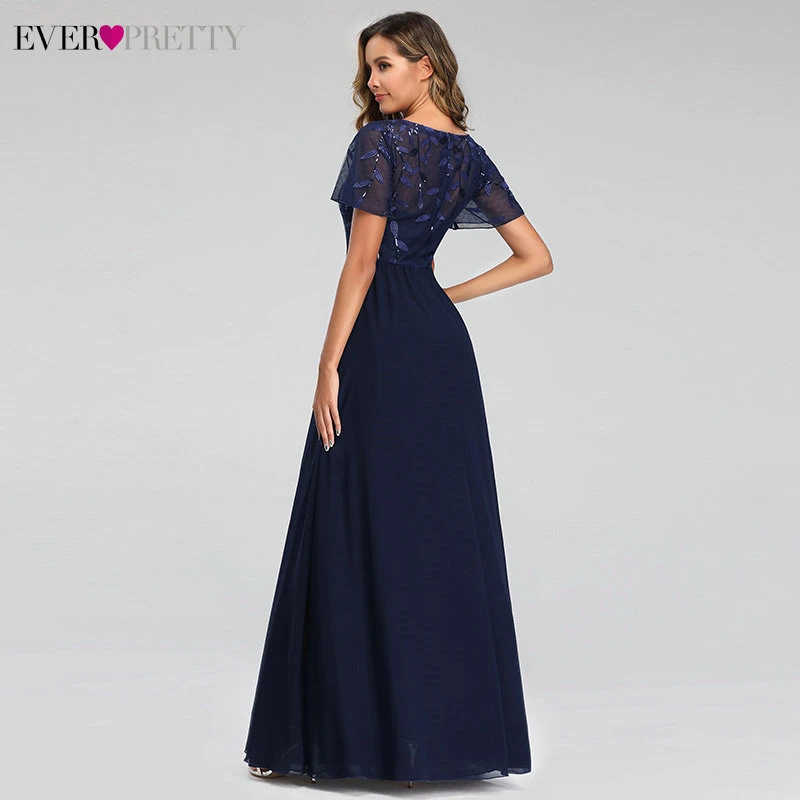 Special Offer Lunghi Abiti da sera Mai Abbastanza EZ07706 Elegante Navy Blu Una Linea di Manica Corta Chiffon Del Merletto Del Ricamo Abiti Del Partito per la Cerimonia Nuziale Discount 45% Today!