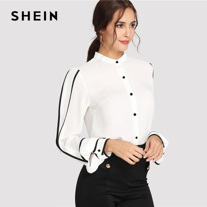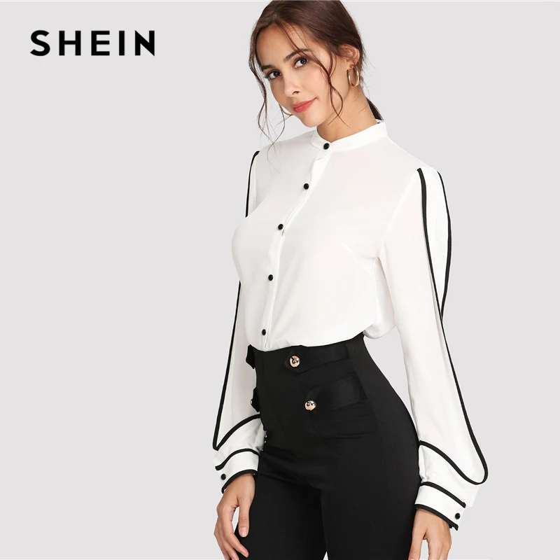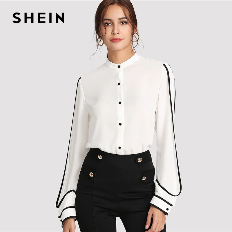 Special Offer SHEIN Bianco Elegante Del Collare Del Basamento Manica Lunga Pulsante Nero A Strisce Camicetta Donne di Autunno Abbigliamento Da Lavoro Camicia Top Discount 41% Today!