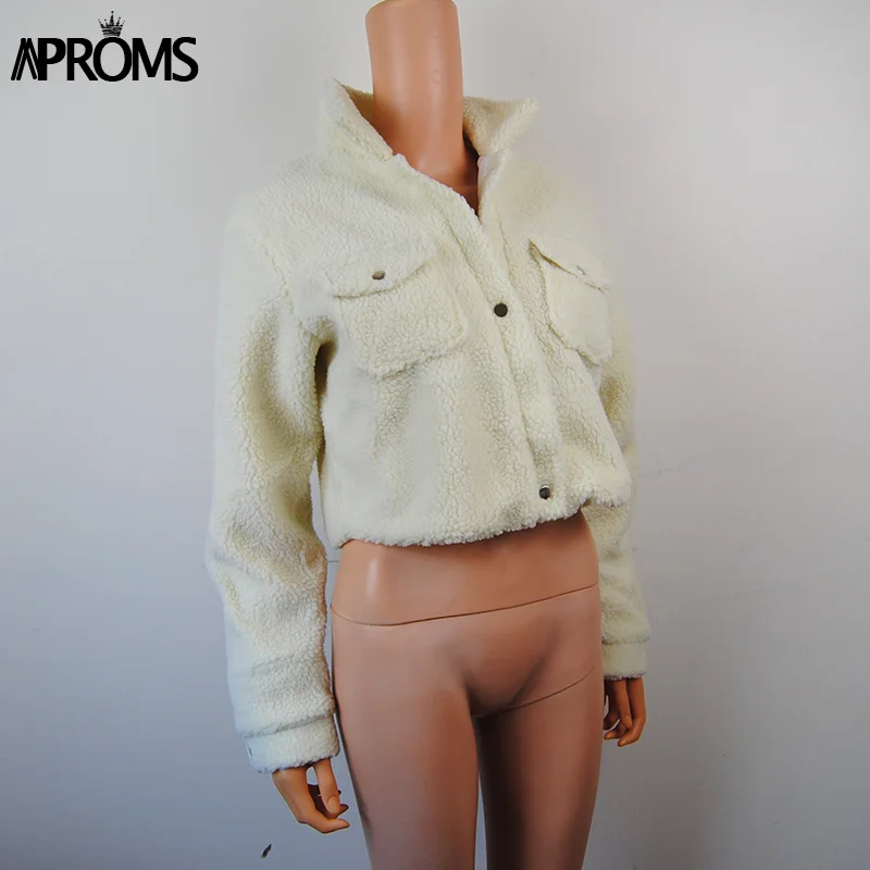 Product Name: Aproms Nero di Modo Tasche Bottoni Giubbotti Maglia A Manica Lunga Sottile Crop Top Cappotti di Inverno Freddo Ragazze Streetwear Giacca Corta