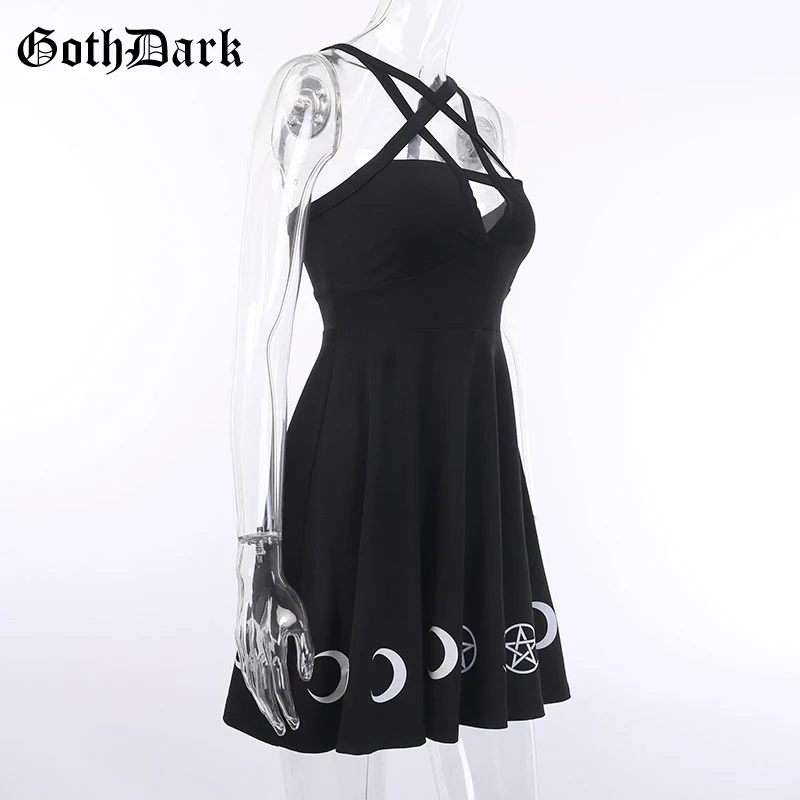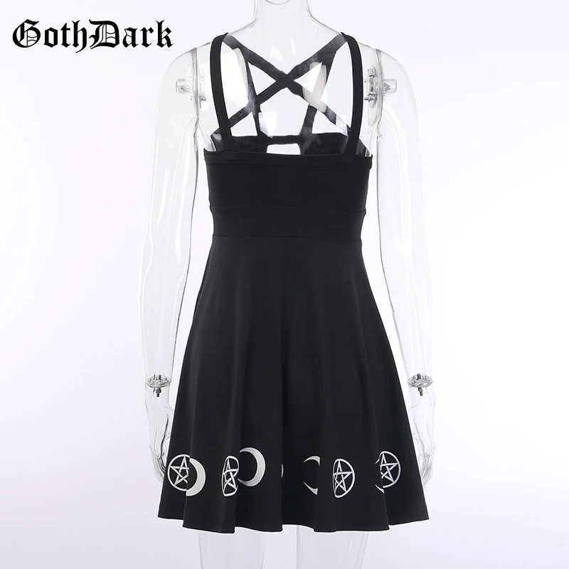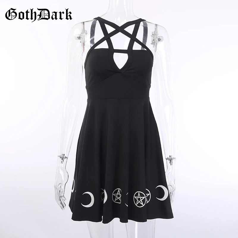Special Offer Goth Nero Scuro Stampa Punk Gotico Del Vestito Harajuku Punk Pieghettato Scava Fuori Pentagramma Vestito Da Estate di Modo Dell annata Sexy Abiti Discount 49% Today!