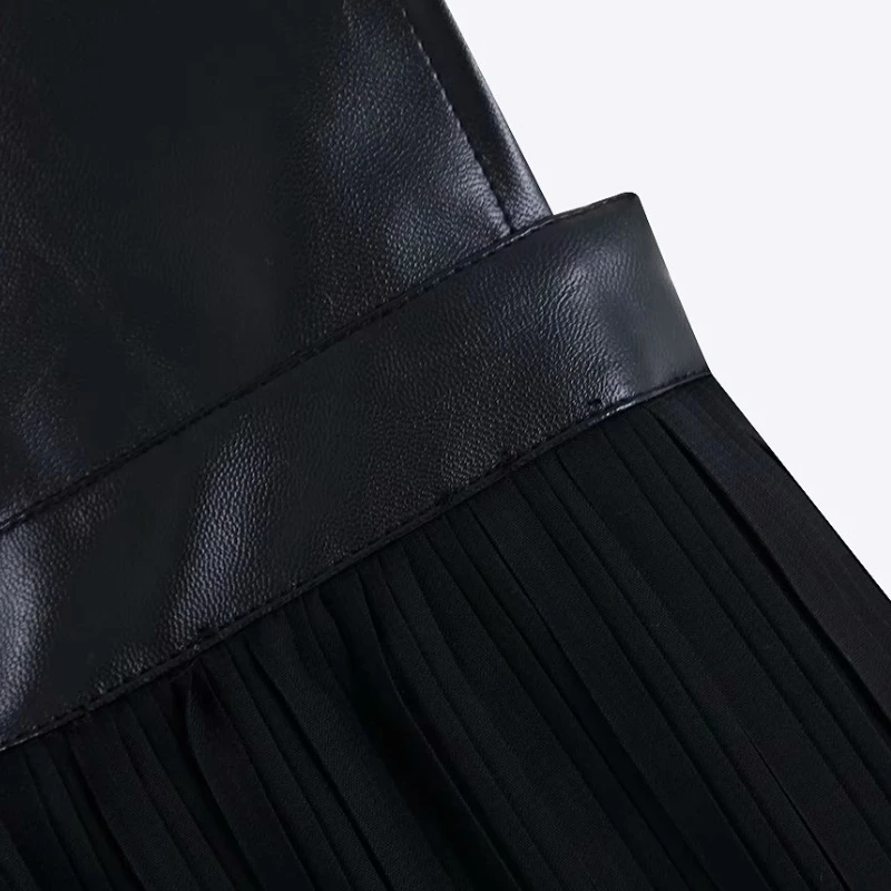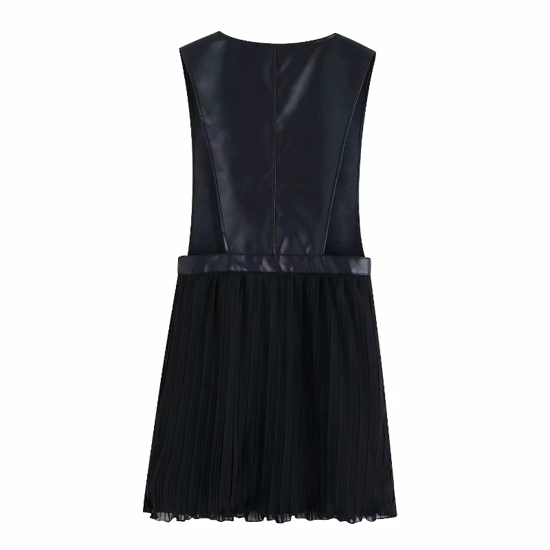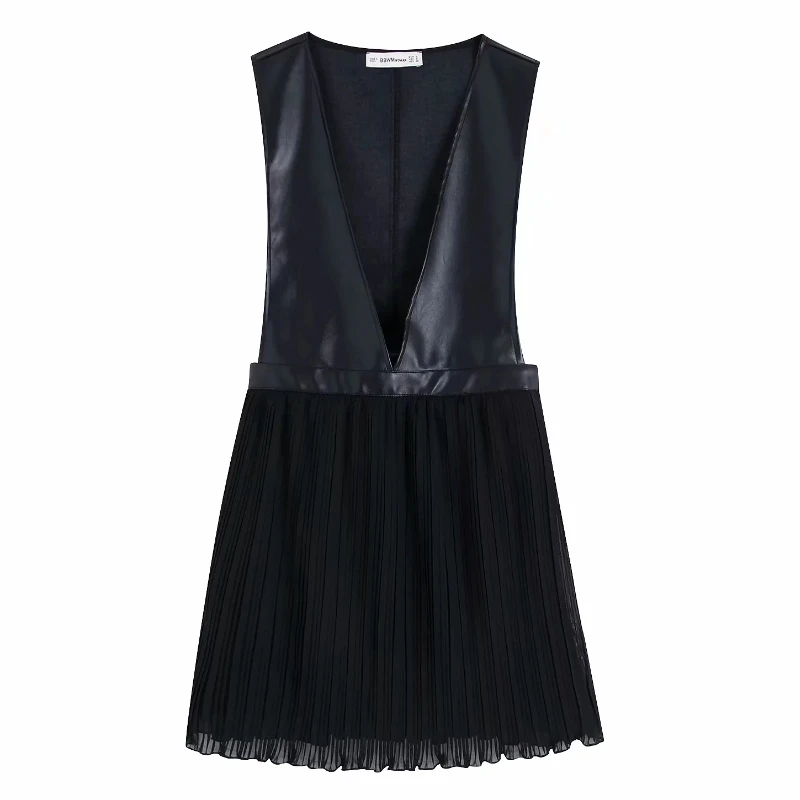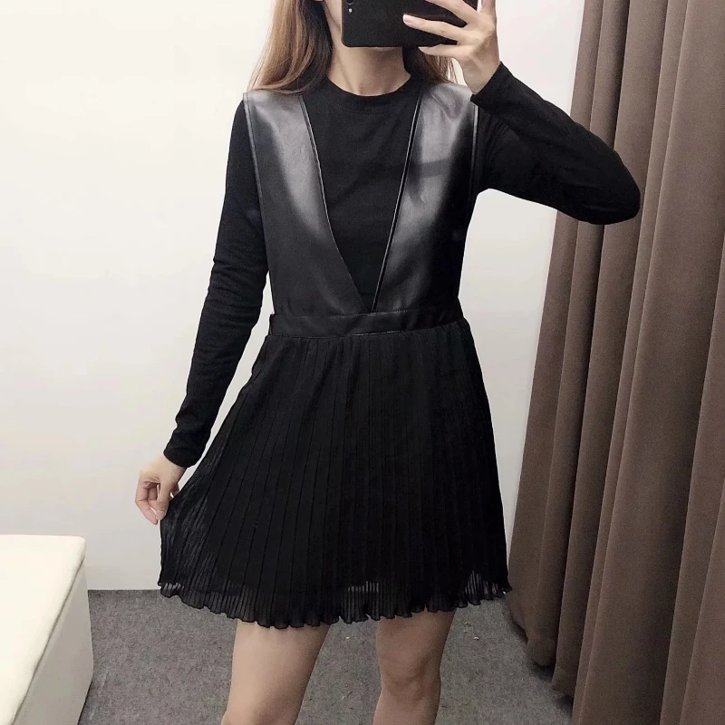 Product Name: Donne elegante profondo scollo a v di cuoio DELL UNITÀ di elaborazione patchwork hem chiffon pieghettato mini Vestito delle signore di autunno casual abiti Abiti neri DS2938
