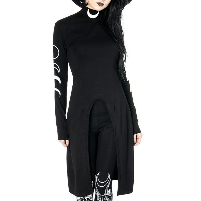 Product Name: Gotico Luna di Stampa Abiti Grunge A Collo Alto A Maniche Lunghe Mini Vestito di Modo Disegno di Fondo Split Nero Buio Streetwear Vestito