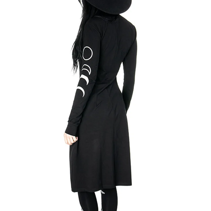 Special Offer Gotico Luna di Stampa Abiti Grunge A Collo Alto A Maniche Lunghe Mini Vestito di Modo Disegno di Fondo Split Nero Buio Streetwear Vestito Discount 44% Today!