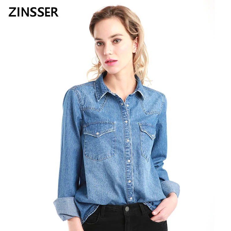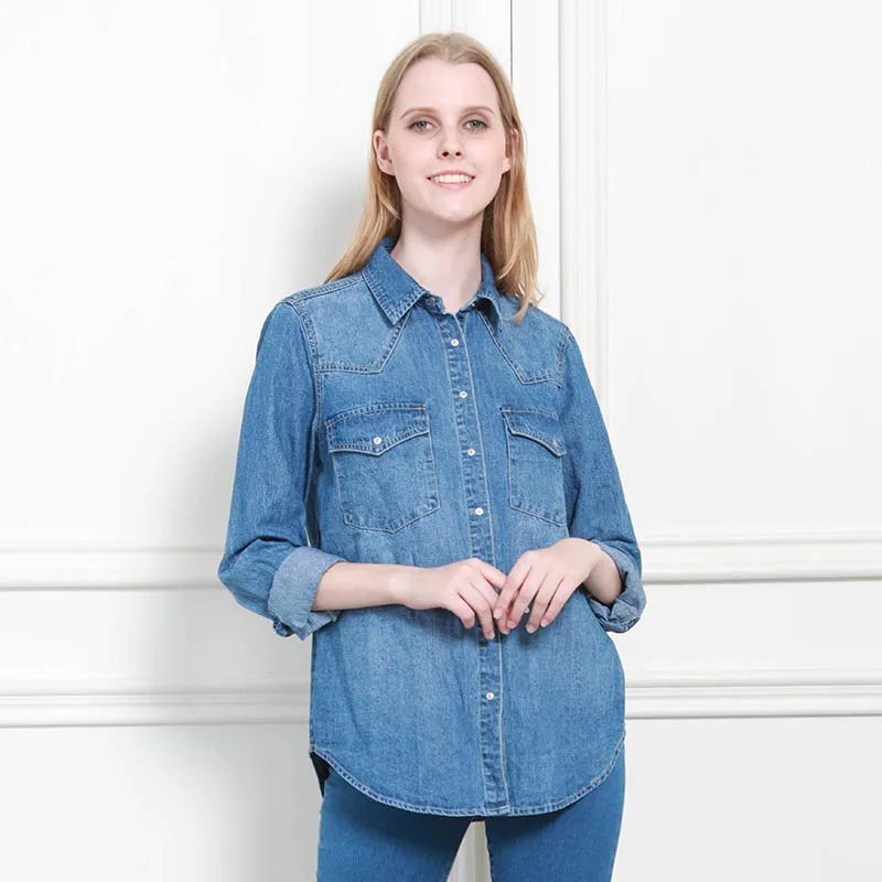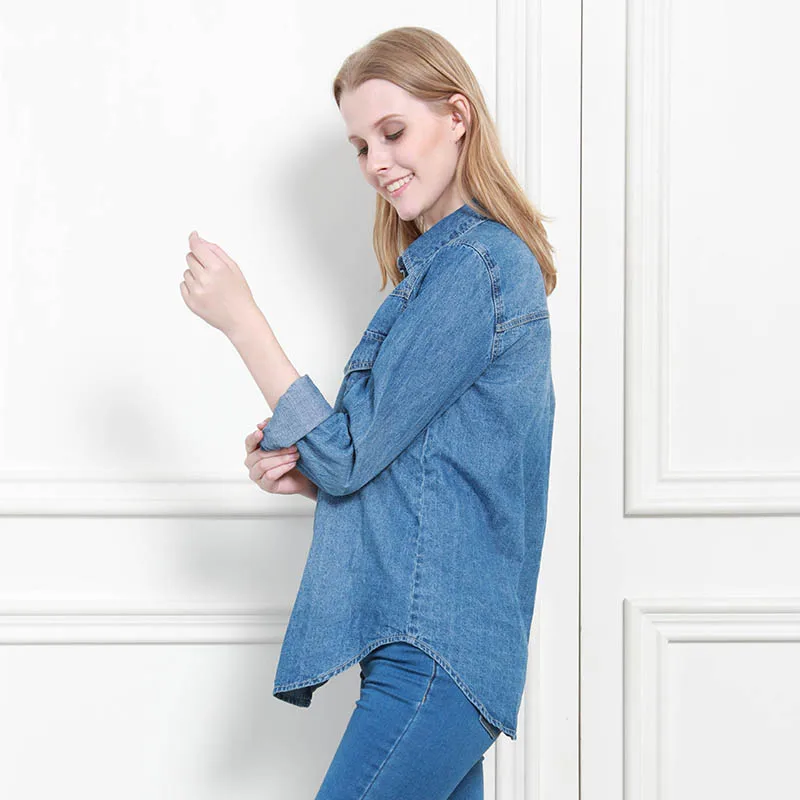 Special Offer 11.11 Donne di Inverno di Autunno Del Denim Camicia di Base Allentata casual A Manica Lunga Con 2 Tasche 100% Cotone Lavato Blu Femminile Camicetta top Discount 47% Today!