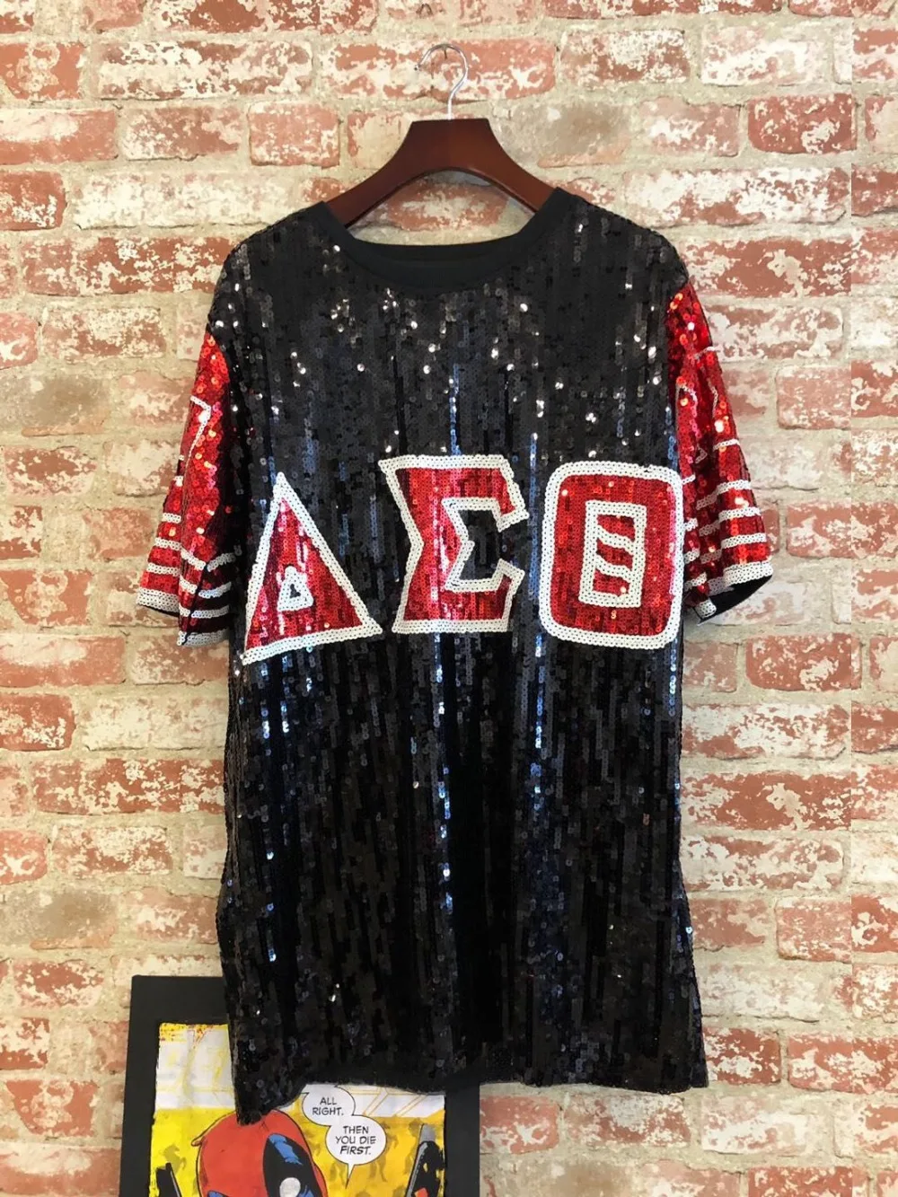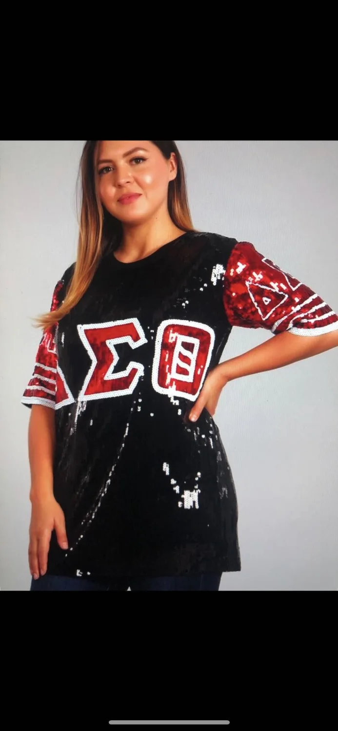 Product Name: Sequin Lungo O Collo T shirt rosso Nero AEO DST Sorority Paillettes T Shirt Vestiti Del Partito Club Top Vestiti Larghi