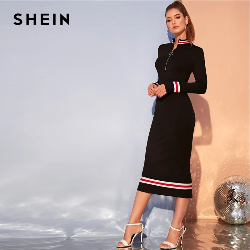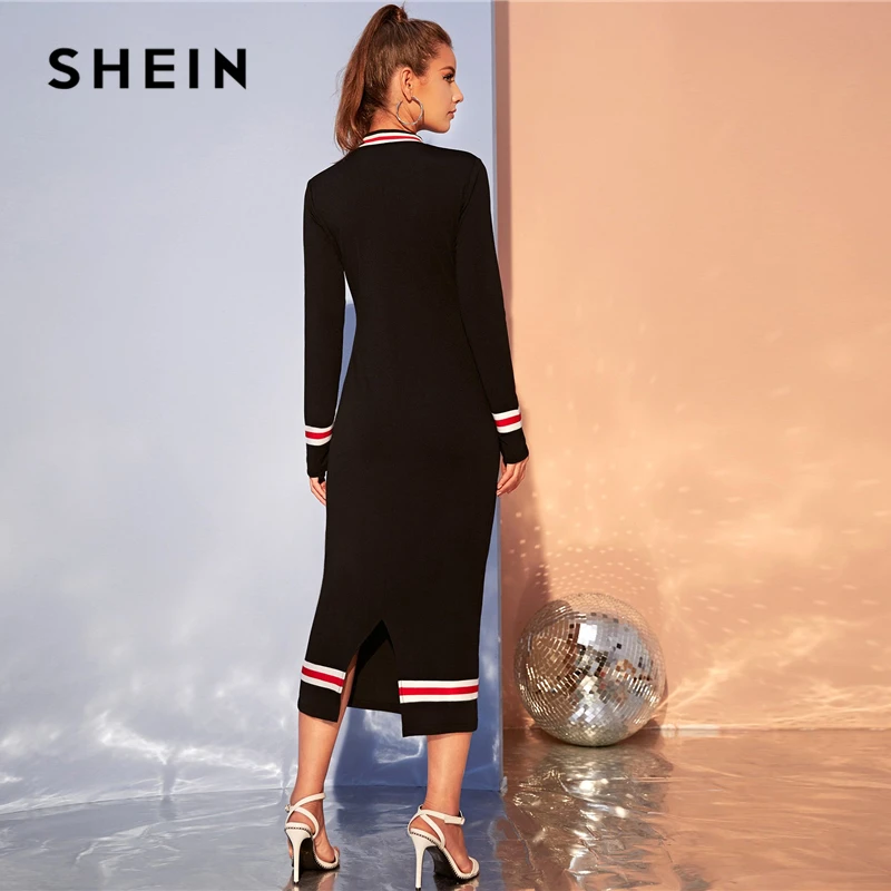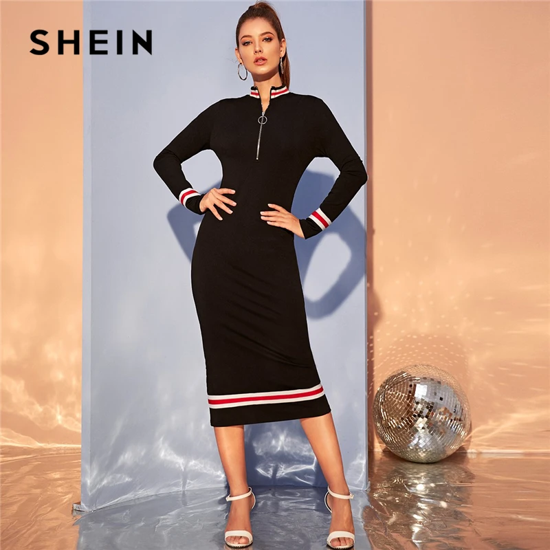. (50% Off) Comprare SHEIN Nero O ring Con Zip Frontale Spalato Hem Nastro A Righe Aderente Vestito Lungo Delle Donne di Autunno Del Collare Del Basamento di Sport casual abiti matita Miglior Prezzo Online.