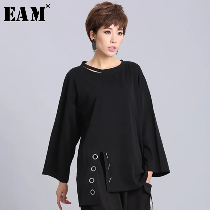 Special Offer [EAM] 2019New Primavera Estate Nero Manicotto Pieno O Collare Diviso Pullover Delle Donne di Personalità di Modo di Marea Allentato casual T Shirt OA881 Discount 17% Today!