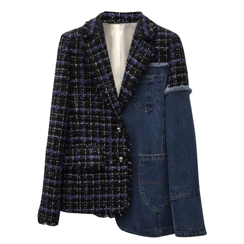 Special Offer [EAM] 2019 Nuova Primavera Risvolto Manica Lunga Blu Del Denim Plaid Punto Irregolare Allentato Rivestimento Delle Donne del Cappotto di Modo di Marea JI747 Discount 17% Today!