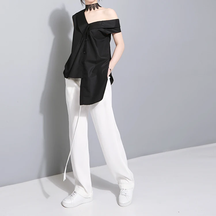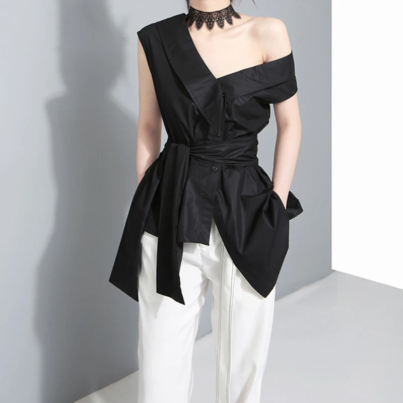 Special Offer TWOTWINSTYLE Senza Maniche Fiocchi e Fasce Tunica Camicette delle Donne Camicette Estate 2019 Del Collare di V Nero Khaki Irregolare Slaccia la Camicia Magliette e camicette casual Discount 20% Today!