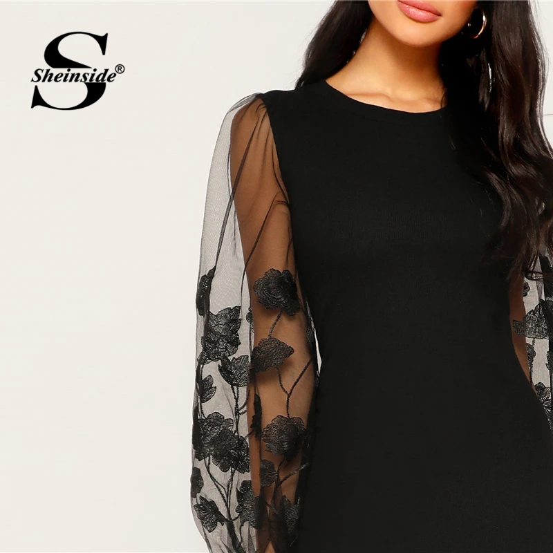 Special Offer Sheinside Elegante Nero Del Ricamo Della Maglia Del Manicotto Della Lanterna Delle Donne del Vestito Solido 2019 Primavera Bodycon Vestiti Delle Signore Elastico Midi Dress Discount 46% Today!