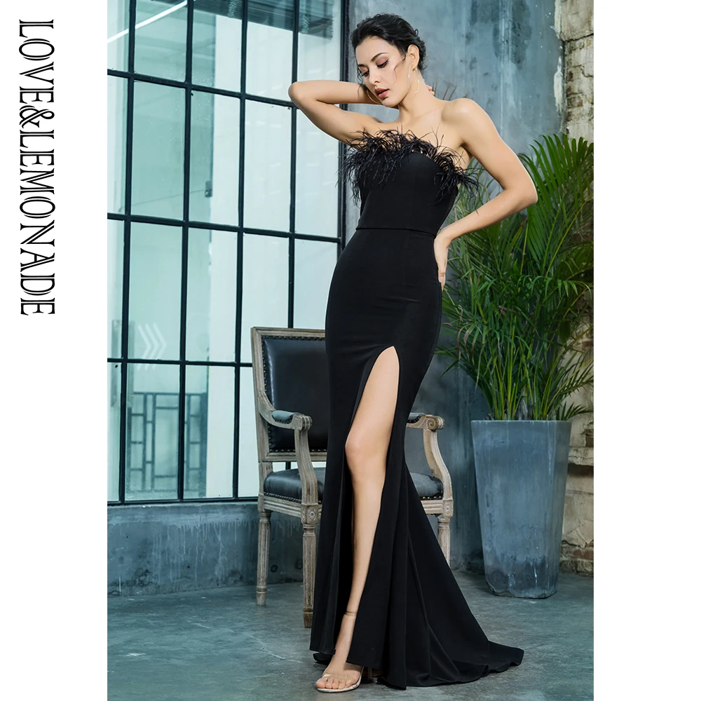 Product Name: Amore Limonata Nero Senza Spalline Cut Out Della Piuma Vestito Lungo LM81481