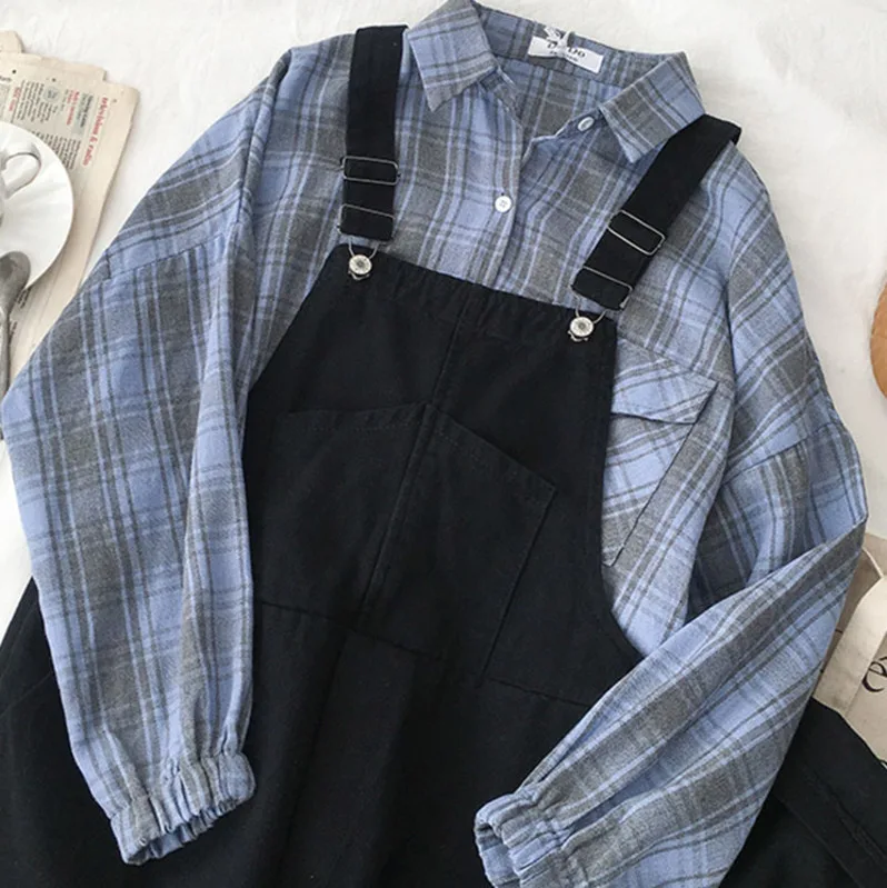 . (36% Off) Comprare Harajuku casual Generale Set di Estate Delle Donne A Due Pezzi di Modo Blu A Maniche Lunghe Camicia A Quadri + Nero Lunga Allentata Pant estate Set Miglior Prezzo Online.