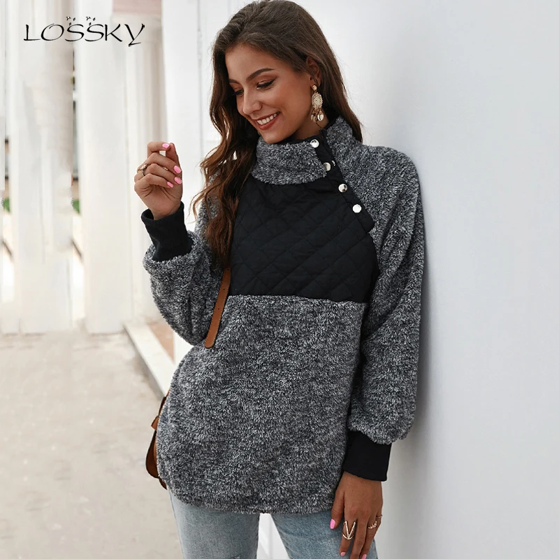 Special Offer Lossky Felpe Maglia A Manica Lunga di Colore Della Rappezzatura Fahsion Autunno Inverno Pullover Nero Delle Signore di Peluche Caldo Magliette e camicette Abbigliamento 2019 Discount 39% Today!