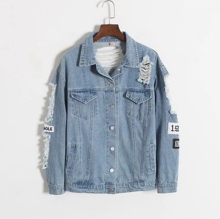 Product Name: Trasporto di goccia Dov è la mia mente Della Corea retro sfilacciato ricamo lettera di patch bomber giacca Blu Strappato Distressed Denim Cappotto Femminile