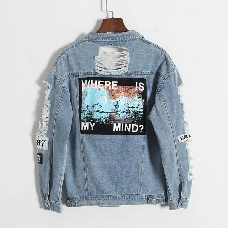 . (0% Off) Offerte Trasporto di goccia Dov è la mia mente Della Corea retro sfilacciato ricamo lettera di patch bomber giacca Blu Strappato Distressed Denim Cappotto Femminile Miglior Prezzo Online.