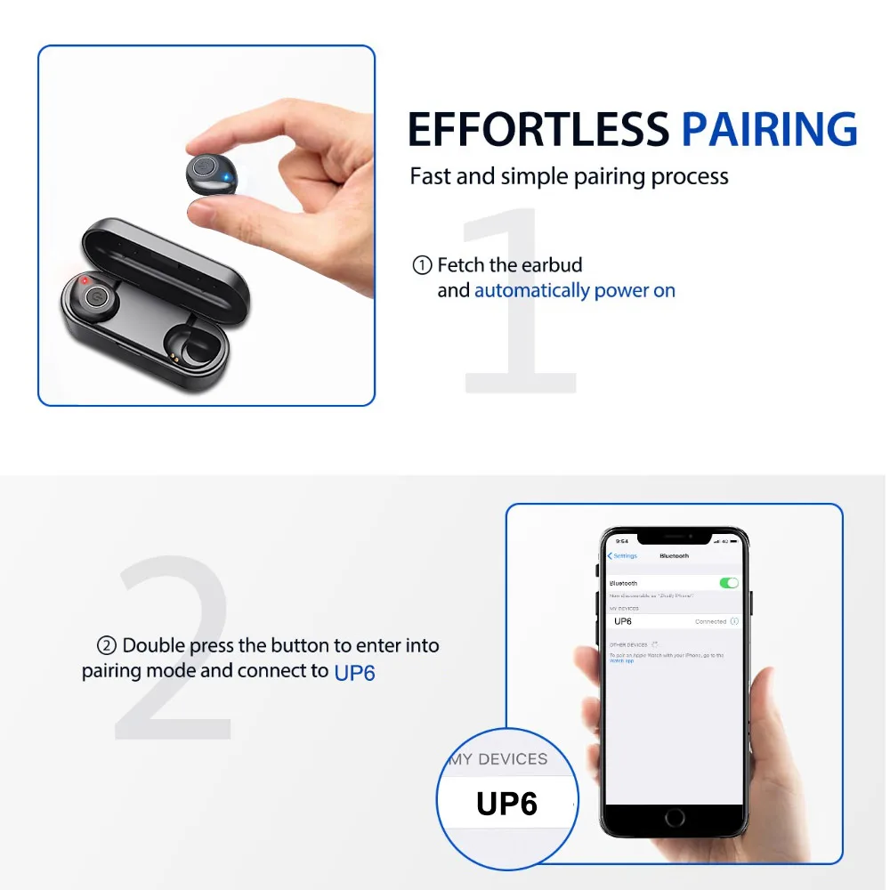 Product Name: UP6 Cuffie Senza Fili TWS Bluetooth 5.0 Auricolare Stereo Auricolare IPX5 Impermeabile di Sport Auricolari con Doppio microfono per il Telefono